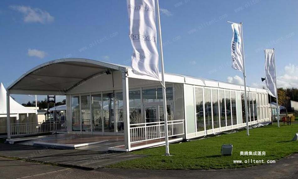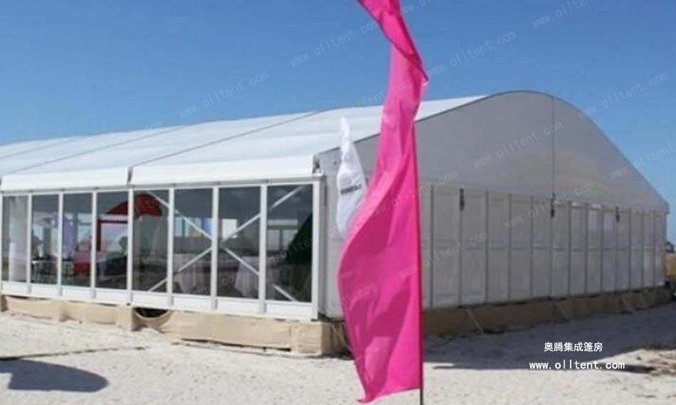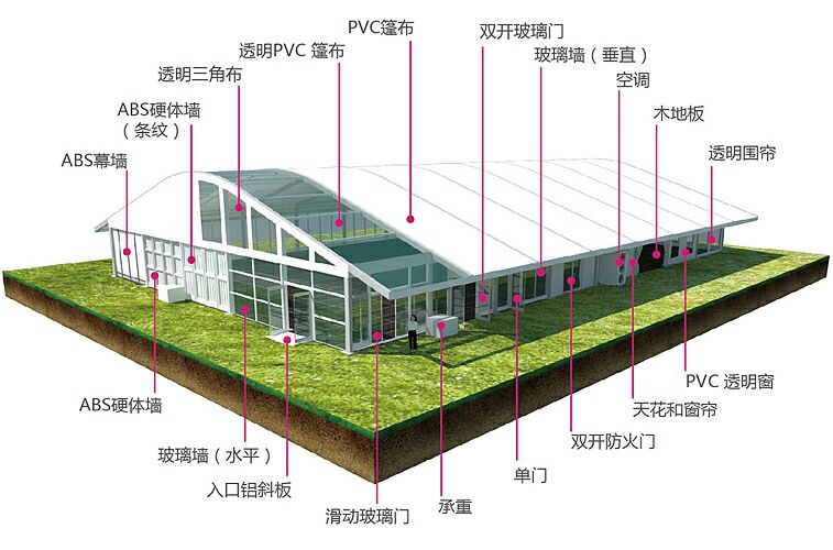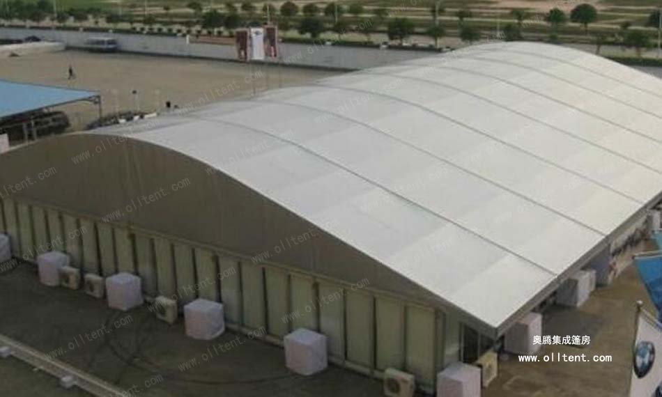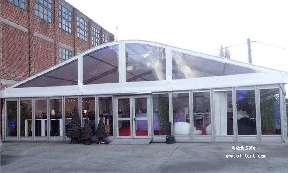 弧頂篷房有多種可供選項購的配置,其功能和用途更為強大。例如:ABS墻體、三明治墻體、彩鋼瓦墻體、玻璃幕墻、透明頂、頂幔布幔內(nèi)飾、排風(fēng)扇、卷簾門、玻璃門、承重盤承重框、地板系統(tǒng)、排水槽等