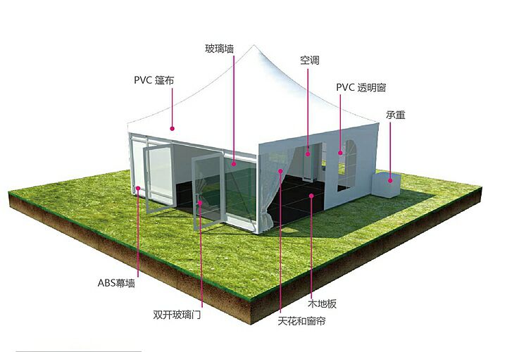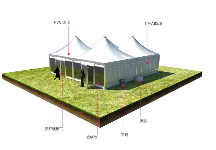 尖頂帳篷有多種可供選購的配置,例如:玻璃墻體、玻璃門、木地板、地錨釘和天花內(nèi)飾等。錐頂帳篷除了用單獨(dú)使用外,還可以將它用排水槽連接起來組成更大的面積,形成獨(dú)特的造形,在戶外活動應(yīng)用中更加精彩。